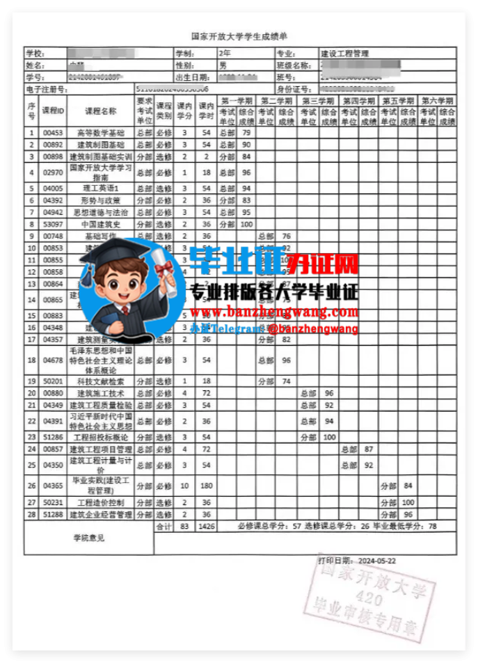 国家开放大学成绩单丢失怎么补办,国家开放大学成绩单样本图片,国家开放大学成绩单模板,国家开放大学成绩单翻译成英文,国家开放大学成绩单申请流程 国家开放大学成绩单具有以下特色,结合您提供的成绩单示例可进一步说明: 1.信息全面且规范 个人与学生基本信息:明确标注学校、学制、专业、姓名、性别、出生日期、学号、身份证号、电子注册号、班级等,确保学生身份唯一性与可追溯性。 课程维度信息:包含课程ID、课程名称、要求(必修/选修)、课类(必修/选修)、学分、课内学时,清晰区分课程性质(必修/选修)、学分权重与学习时长,便于理解课程定位。 2.成绩呈现结构化(多学期+综合考试) 多学期成绩跟踪:按“第一学期至第六学期”分列,每门课记录考试(综合考试)成绩、学分,部分课程还体现“分部成绩”(可能对应学习中心或区域分校的阶段性评价),直观展示学业进展的阶段性成果。 综合考试(统考)整合:对部分课程单独标注“综合考试综合成绩、学分”,体现国家开放大学“形成性考核+终结性考试(统考)”的评价体系,成绩记录更全面。 3.学分与总学分统计清晰 学分分类汇总:单独列出“必修课总学分”“选修课总学分”,并标注“毕业最低学分”,方便学生/院校快速核对是否达到毕业要求(示例中毕业最低学分78,需结合必修+选修完成情况判断)。 总学分与总学时统计:底部汇总“合计学分、学时”,直观呈现学业投入的总量。 4.学制与专业适配性强 示例中学制为“2年”、专业为“建设工程管理”,成绩单结构与课程设置(如建筑工程类、思政类、通识类等课程)紧密围绕专业培养目标,课程类型(必修/选修)、学分设置符合职业教育(高职高专层次)的学制与专业培养规律。 5.官方认证与防伪性 底部有“学院意见”“打印日期”“国家开放大学毕业审核专用章”,体现成绩单的官方权威性与毕业审核效力,印章与格式符合成人教育学历证书/成绩单的规范,具备防伪与认证价值。 6.课程类型丰富(职业导向) 课程涵盖专业基础课(如高等数学基础、建筑制图基础)、专业核心课(如建筑施工技术、工程造价控制)、实践实训课(如建筑测量实训、建筑构造实训)、思政课(如毛泽东思想和中国特色社会主义理论体系概论)、通识课(如理工英语)等,体现“职业能力培养+综合素质提升”的开放教育特色,课程类型与专业(建设工程管理)的职业需求高度匹配。 7.成绩记录精细化 部分课程区分“考试(综合考试)成绩”与“分部成绩”,可能对应“全国统考(如英语、计算机)”或“学习中心内部考核”,成绩记录维度更细,反映开放教育“多元评价、过程+终结结合”的考核特点。 总结 国家开放大学成绩单通过结构化信息、多学期跟踪、学分分类、职业导向课程、官方认证等特色,既满足成人教育“灵活学习、职业导向”的培养目标,又通过规范的成绩记录与官方印章,保障学历成果的权威性与可追溯性,同时清晰呈现学生的学习过程与成果,便于院校、用人单位或学生本人核查学业完成情况。 【以上样本由办证网制作提供发布,需要转载请注明:办证网】 欢迎来到办证网,唯一官网域名http://www.banzhengwang.com/。 承接办理排版各大学专版(本科/硕士/博士)毕业证、学位证、成绩单、职业资格证,最新专版毕业证制作。 制作各类毕业证专版排版,专业PS制作排版个学校专版毕业证,办理各类证件。 办证网以最优质的质量和服务解决广大客户的办证难题,诚信服务,全球各国接单 可邮寄到各国,真正让您足不出户轻松办毕业证。 办证联系方式:Telegram飞机号:@banzhengwang |